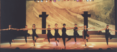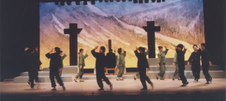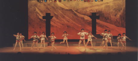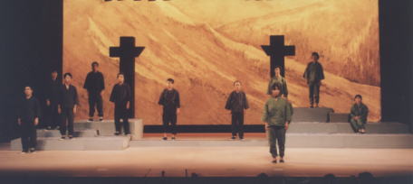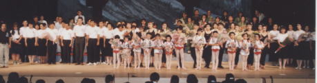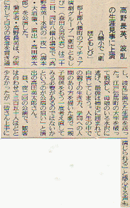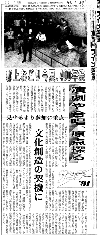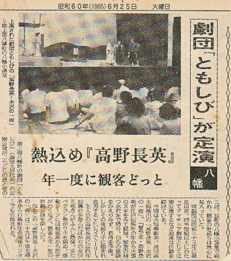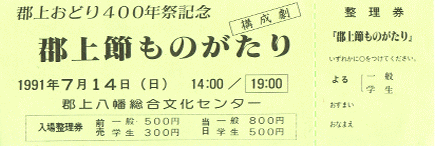 郡上踊り4百年祭り開幕2日目の7月14日 八幡総合文化センターで郡上節ものがたりが上演された。 昭和20年、終戦の日、戦争で死んだひとの冥福を祈りながら 踊ることによって苦しみを 乗り越えようとした住民の姿を史実に基づいて描いた。脚本、演出は高田英太郎