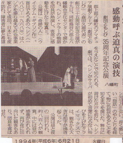 1994年6月と7月に八幡文化センターで奇跡の人が上演されました。