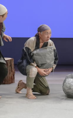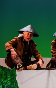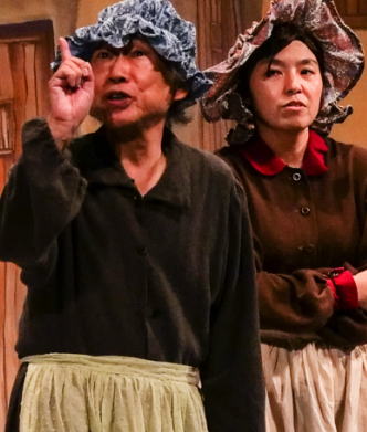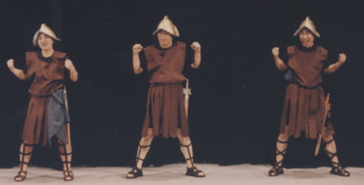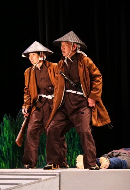 | 歌にダンスにお芝居に、コミカルな おかまの兵隊を演じる(左より安田浩子・和田裕・川上朝史) |