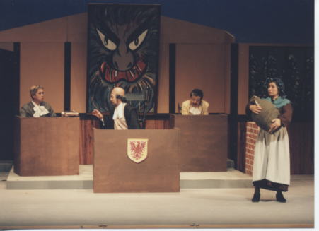 | その上今日は村の裁判開廷日。 マルテ・ルルが、娘エーフェの所へ誰かが 忍んで来て、けしからん振る舞いをした挙句 家宝の甕をこわしたと訴えてきた |