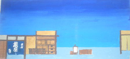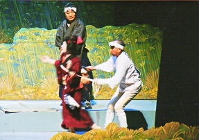 ![]() 偶然 忠兵衛の父親 孫右衛門が通りかかり 溝の氷にすべり 鼻緒を切らせて倒れこむ |