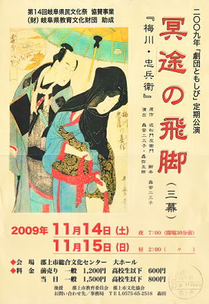| 女郎梅川と恋仲の 飛脚屋 亀屋の養子忠兵衛は 身請けの手付け50両は払えたが 後の金のあてもなく いっそ 心中しようかとも思うが、、、。 |