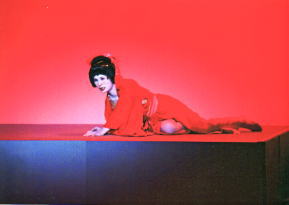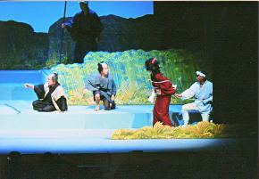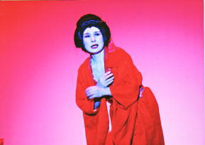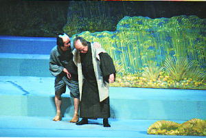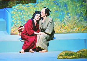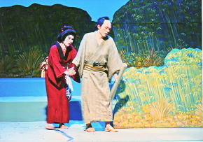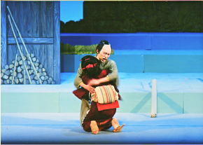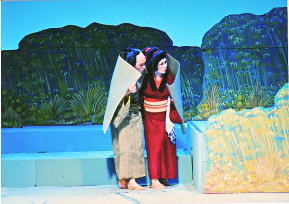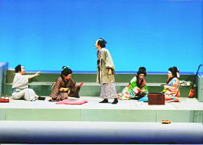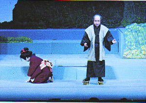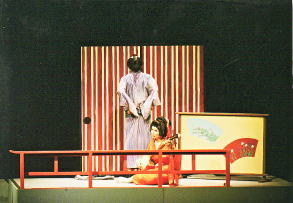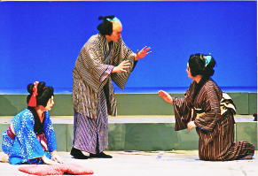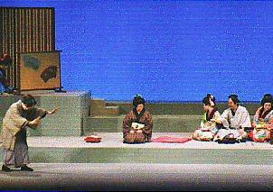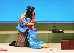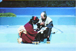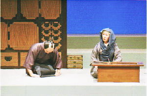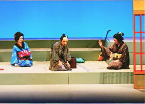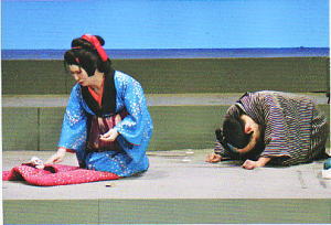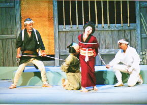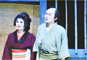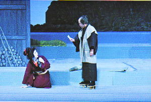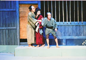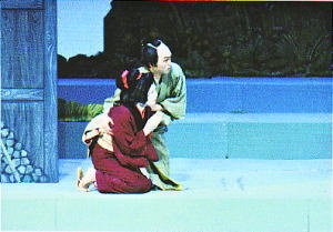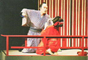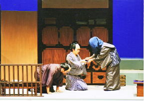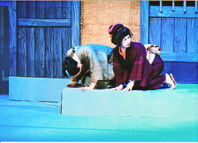 | 嘆く父親の 目の前での己の顔を隠したいという 忠兵衛の願いを叶えて 喜ぶ梅川だが、 忠兵衛は それを押しのけて父親の方へ。 一人取り残される梅川 |