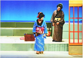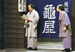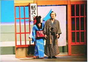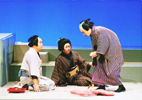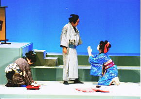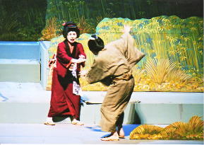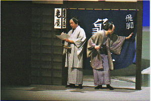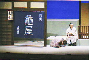 | 破れかぶれの忠兵衛は 八右衛門に返す金で争いに。梅川は思わず飛び出し八右衛門に詫びる | 軽はずみなことをしてしまった忠兵衛を 叱り諭す梅川 |
