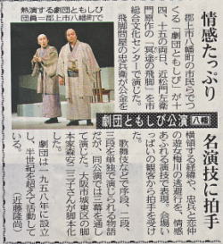 お客様の声 初めて見ました。声がよく聞こえなかったので ピンマイクがあるといいと思います。」 とても感動しました。ありがとうございました。 素晴らしい演技で感動しました。今後も ご活躍を期待します。 初めの方、少し重かった。終幕が良かった。 郡上北高校演劇部顧問をしています。ともしびの劇は今日初めて見せていただきましたが、たいへん勉強になりました。来年もぜひ見せていただきたいと思います。 林 郡上の歴史や民話などを モチーフにしたものがあったら楽しいと思います。素敵なお芝居をありがとう。 涙が出て 感激しました。 皆さんの細やかな熱演 感動しました。 開演時間を早くして 終了時間を遅くとも 4時頃までにしていただけると良い。演技は素敵でした。 主役以外の人の声が聞き取りにくかった。 とても素晴らしい。次回を楽しみにしています。 とても面白かったです。 熱演に感動した。今後も永く続けてください。 長年続けておられることに 敬意を表します。劇団が益々御発展されることを祈っています。 劇団の皆さん これからも素晴らしい芝居をたのみますよ。今晩はありがとう、感動した。 思わず泣けてくるような 迫力のある演技が 素晴らしかったです。 出演者の皆様の熱演に 感動しました。 奥田君の演技、良かったです。ただ、もう少し恋に狂った狂気のようなものがあると 深くなったのかも。歳をかさねた時の彼の忠兵衛を もう一度見てみたいです。熟練の皆様の演技が 重みをつけていて 流石だと思いました。「梅川」は最高ですね。 台詞がたいへん上手でした。景色も良かった。 観皆さんの熱意が伝わってきて 良かったです。 なんて いらいらする話でしょう! 初めて観劇しました。こういう機会を与えていただき 嬉しかったです。 忠兵衛、梅川 以外の役の台詞が いくつか聞き取れないところがあり 惜しかった。全体の雰囲気は良かった 熱演で良かった。 皆様の努力に感激しました。日々の生活の中でたいへんでしたね。今後 時間の事を一口申しますと、主婦の意見として 午後は1時より 4時頃までに終わってくださるよう期待します。 たいへん良かったです。 年月が経つたび良くなり、良かったと思います。 初めて観ました。感動しました。壺阪寺の物語 「おさと・沢市」 希望します 良かったです。 熱演で演出もていねいに心配りがされていて、長時間でも飽きずに最後まで見ることができました。他の劇団に比して、少しテンポが遅く(流れ、喋り方)間延びした感じがします。現代のTVの若手芸人の喋り方に耳が慣れている事もありましょうが。 皆さんたいへん演技が地についていらっして 引き込まれました。次回は笑いのある楽しい芝居を期待します。 一人一人の役者が魂をこめて熱演されて素晴らしかったです。今後もご活躍を期待します。 生きようとしていました。 梅川、忠兵衛の熱演、感動しました。若い方たち 頑張ってください。 それぞれに素晴らしく ベテランばかりです。たいへん良かったです。次も待っています。プロ級 おめでとう ございました 真に迫った演技に感動しております。 毎回見せていただいています。今回はたいへんお上手で 見やすうございました。本当に上達されてこられて ご苦労様でした。次回を楽しみにしています。やっぱり 和現代ものがいいですね。頑張ってください。 はじめて拝見しました。梅川忠平衛を 普通の芝居にすると リアルすぎて「その金 使っちゃダメだろ。アホか、お前は」みたいに単純に思ってしまいます。 ハッピーエンドのストーリーが好きですが たまにはこういうのもいいかな。今年は迫力があってよかったと思います。 |