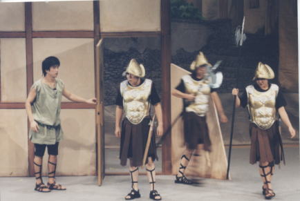 メロスが結婚式に行っている間の身代わりにと セリヌンテウスを連れに兵士がやって来る |
