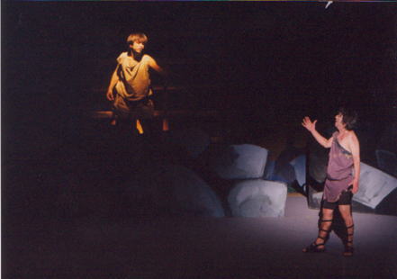 | 帰りの遅いメロスに 疑いの心を持ったセリヌンテウスと 命からがら濁流を泳ぎきり くたくたで心の萎えたメロスは お互いのことを想い 信じる事、約束を果たす事を今一度思い出す |