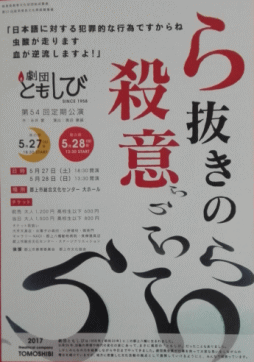 こんにちわ。いつもお世話になっています。「ら抜きの殺意」の公演は大変素晴らしかったです。まさか公演にあれほど多くの人が集まるとは思わず、スケールの大きさを実感しました。舞台のセットも想像していたものよりもはるかにしっかりとしていました。お稽古になかなか見学に行けませんでしたが、今回 劇団ともしびの公演と出会えてよかったです。